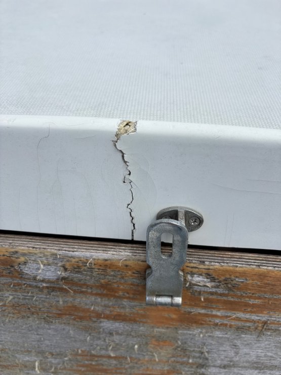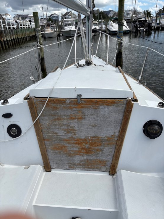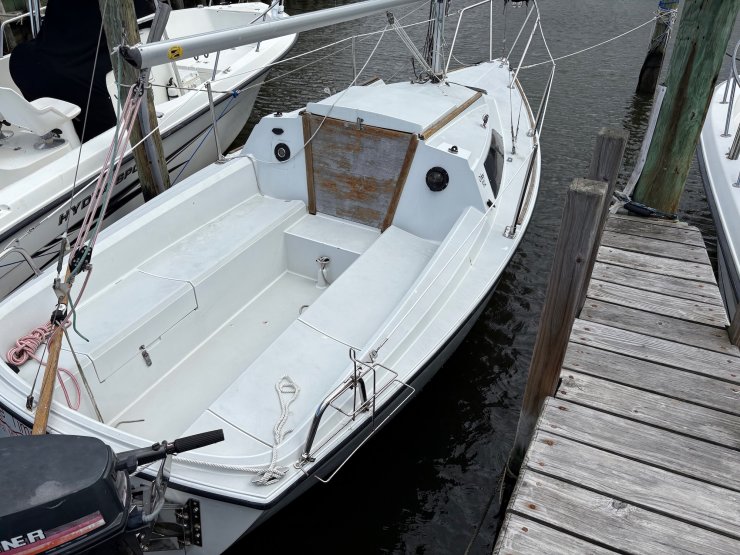 New jib purchased in 2020 (includes Harken roller furler), new main sail purchased in 2022, thru hull depth finder installed in 2023. Cabin is in good shape and is watertight, but there is no V berth cushion. The other cushions dont have the original foam. The crack pictured is on the hatch cover. Included is a 2022 Loadrite trailer in excellent condition and a 5hp Mariner outboard in running condition and recently tuned up. We are the original owners of this boat.