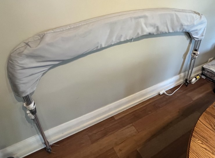 Gray Bimini top for MacGregor 26X. Canvas, frame and zippered cover, all in very good condition. No deck hardware, but standard fittings are readily available online.
